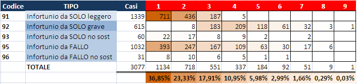 a questo punto possiamo raggruppare i casi singoli in base all'evento specifico, trascurando le distinzioni per descrizione da _1 a _5 e quindi ottenere i numeri relativi ai codici evento in esame (i numeri mancanti 90 e 94 si riferiscono ai semplici "cerotti")